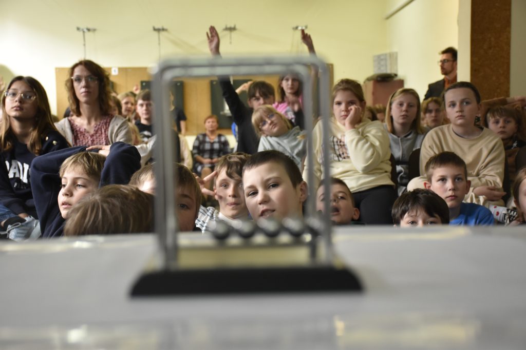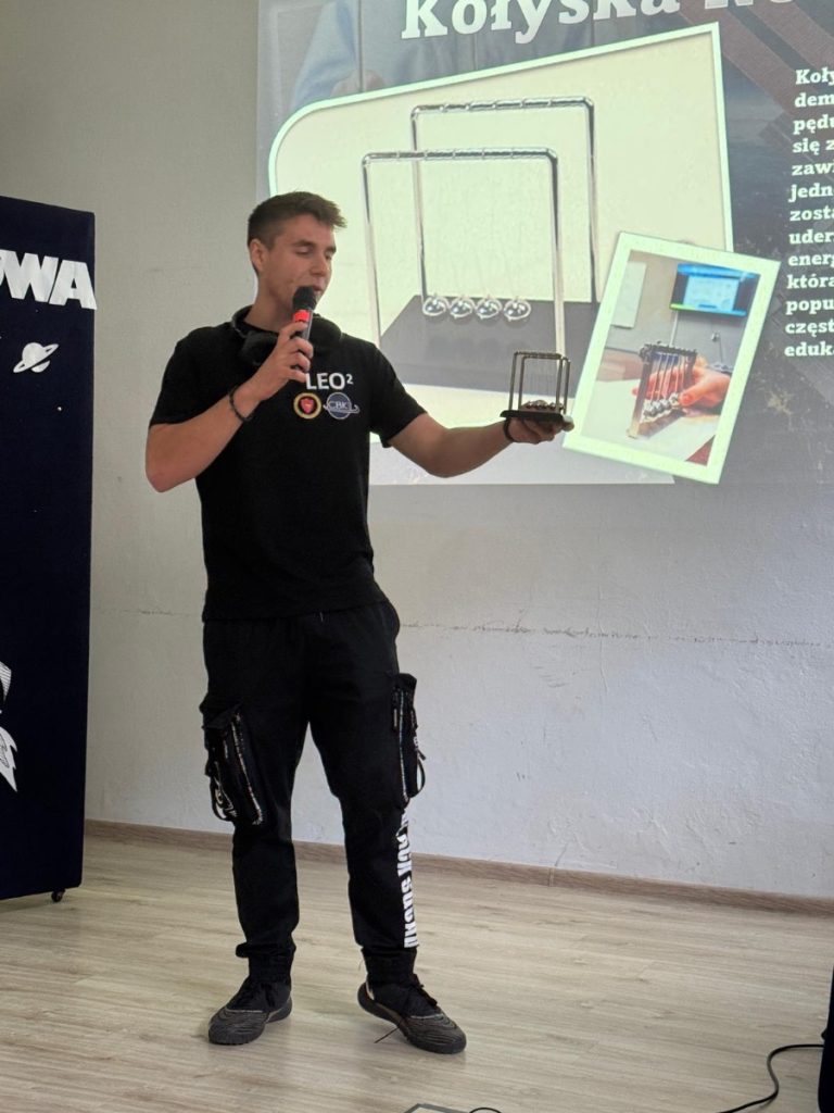 W czasie wykładu zademonstrowali młodszym kolegom doświadczenia takie jak: efekt Magnusa, działanie kołyski Newtona, fontanny łańcuchowej oraz sprawdzili ich umiejętność pracy w zespole, gdzie zadaniem ich było narysowanie rakiety, trzymając marker za przyczepione do niego sznurki przez kila osób.